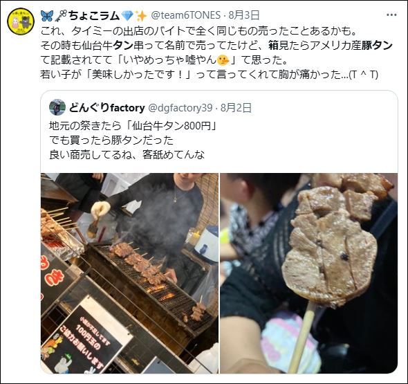 これ、タイミーの出店のバイトで全く同じもの売ったことあるかも。 その時も仙台牛タン串って名前で売ってたけど、箱見たらアメリカ産豚タンて記載されてて「いやめっちゃ嘘やん」て思った。 若い子が「美味しかったです!」って言ってくれて胸が痛かった…(T ^ T)