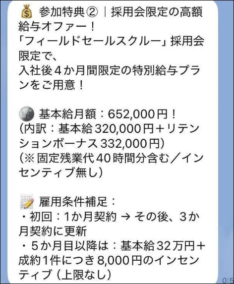 - 「説明会2時間に参加するだけ」「即内定」:実績や適性をほぼ見ない=後で“代理店契約金”“研修費”“端末費”などの請求が出やすいパターン。