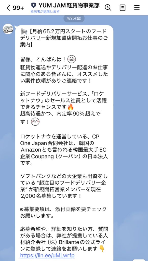 - LINE勧誘→別LINE登録(人材紹介会社Brillante):正規の募集なら公式サイトや求人媒体で完結する。LINEだけで完結は要注意。